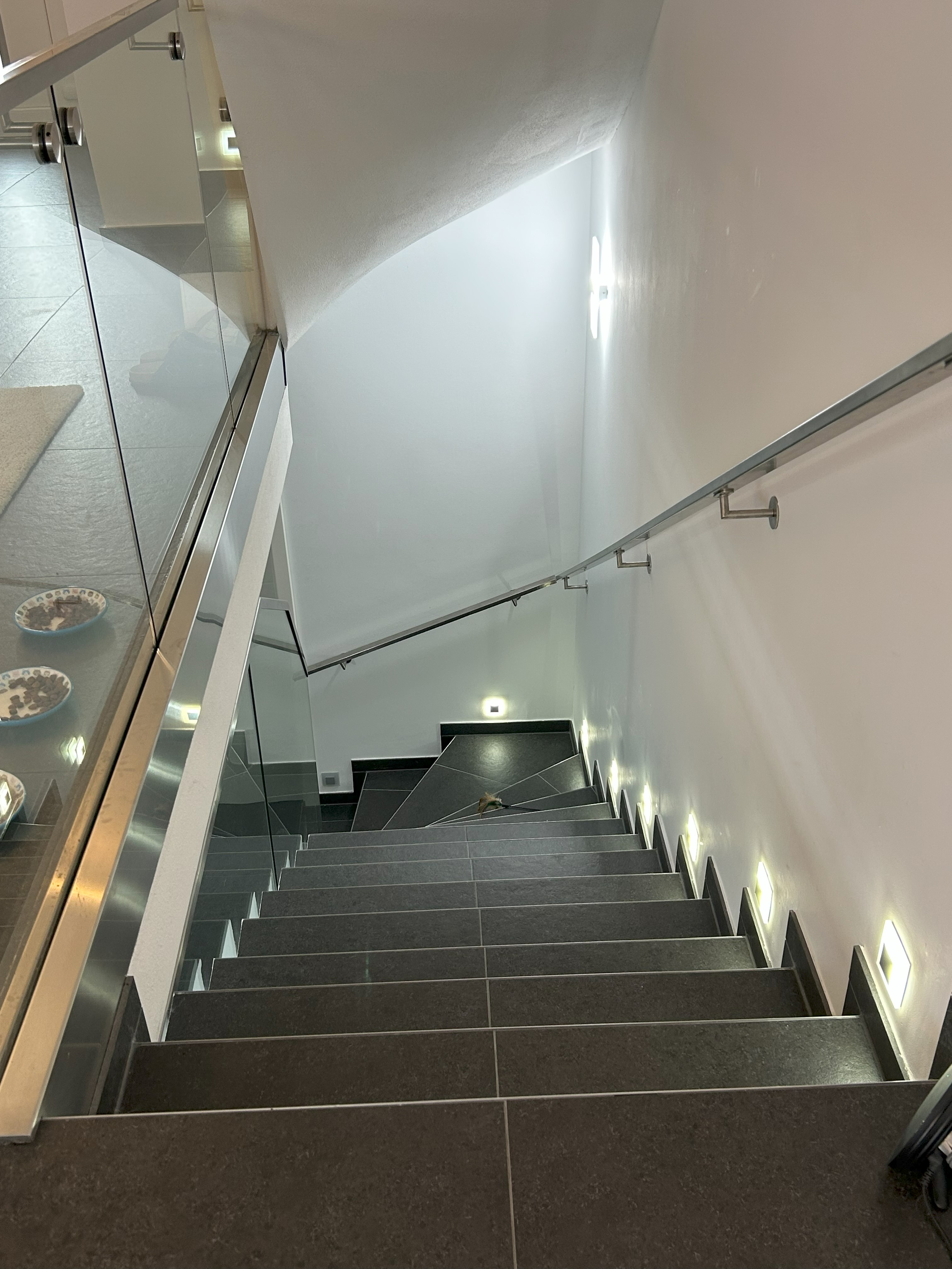 – Individuelle Beleuchtung der gefliesten breiten Treppenaufgängen