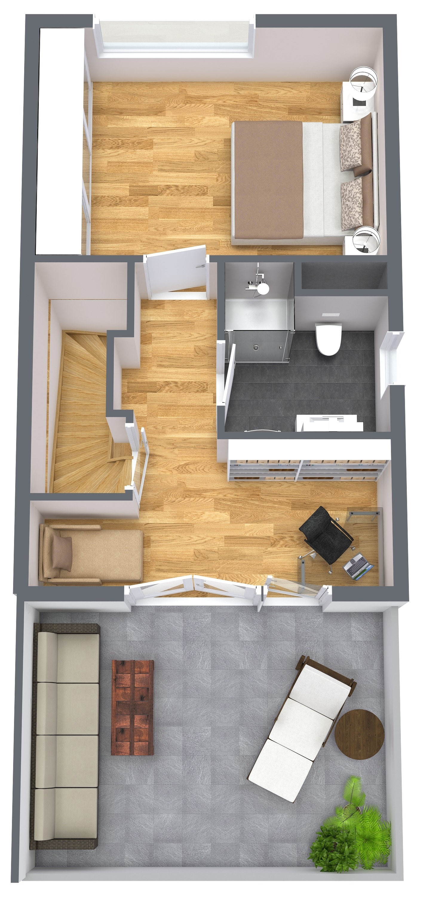 Der erneute Weg über die Treppe führt Sie in das wunderschöne Studio im Dachgeschoss mit eigener Dachterrasse, die durch ihre Ausrichtung zu jeder Tageszeit Sonnenstrahlen verspricht. Empfangen werden Sie im großzügigen Flurbereich mit ausreichend Platz für ein Büro. Das angrenzende Zimmer verfügt über ca. 15 m². Ebenfalls auf dieser Etage befindet sich ein weiteres Tageslichtbad mit bodengleicher Dusche sowie modernen Sanitärobjekte.