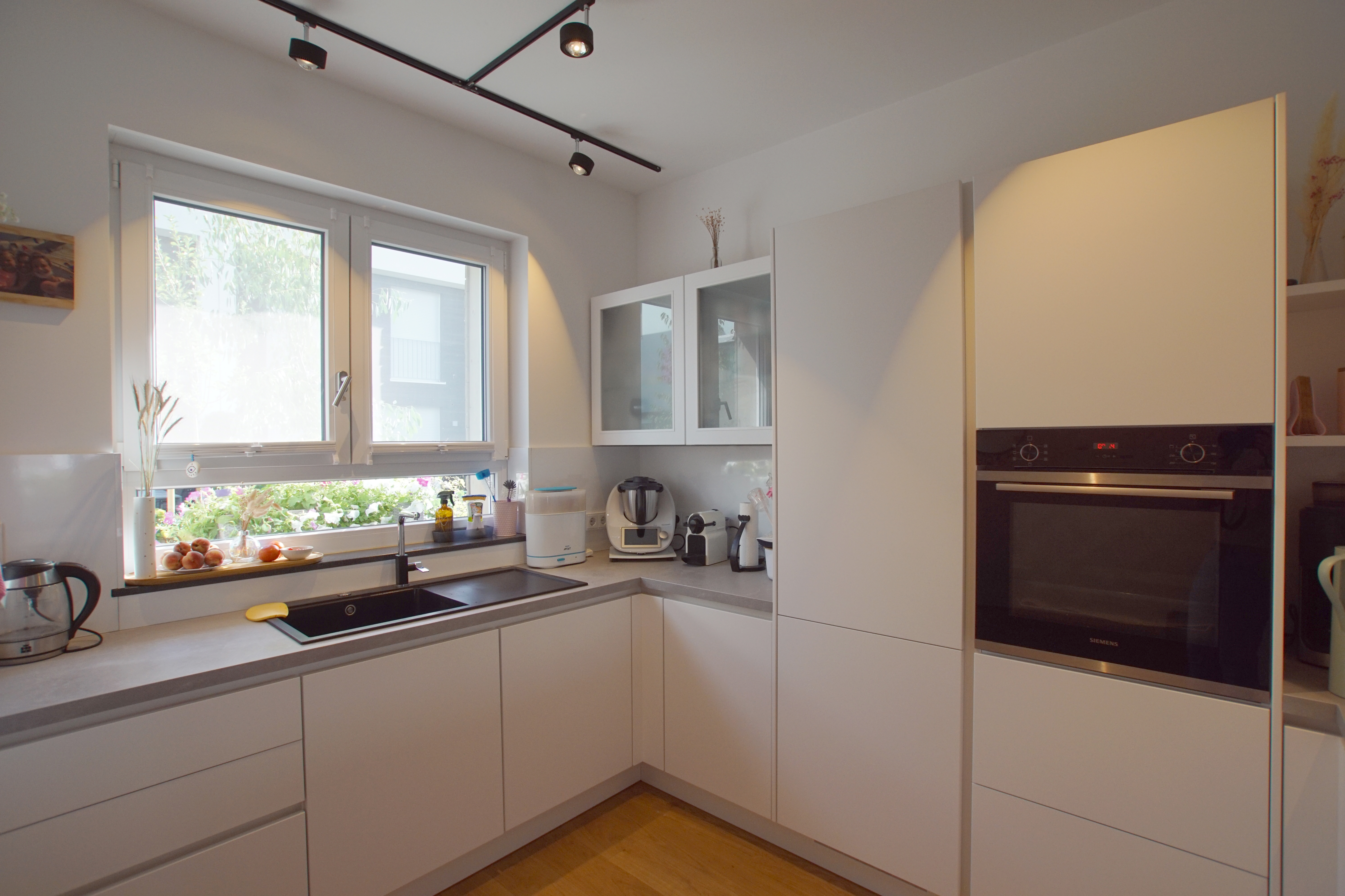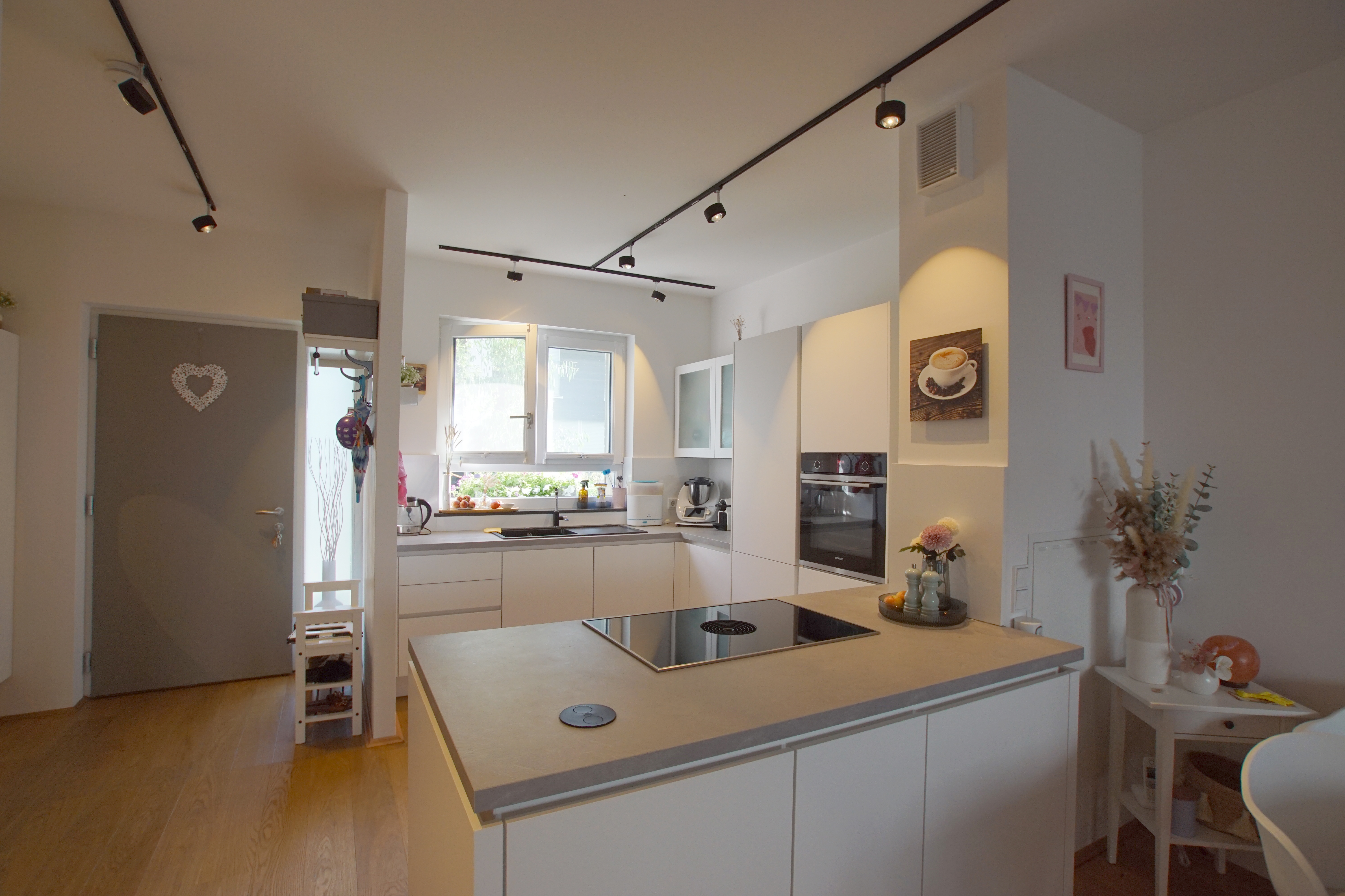 Empfangen werden Sie im großzügigen Eingangsbereich mit genügend Stellfläche für eine Garderobe und Blick in den ca. 27 m² großen lichtdurchfluteten Wohn- und Essbereich, mit Austritt zum Garten und der Terrasse. Die offene Küche schließt sich an den Essbereich an. Die helle Einbauküche verfügt über hochwertige Elektrogeräte.