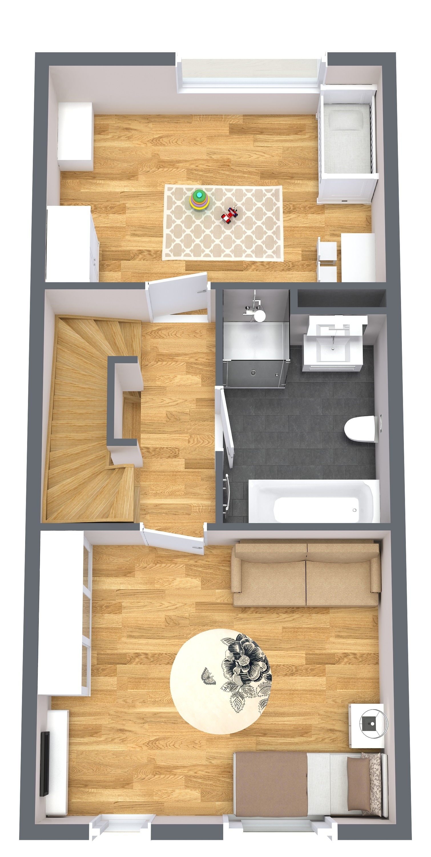 Die Treppe führt Sie ins 1. Obergeschoss. Auf dieser Etage befinden sich zwei nahezu gleich große Zimmer. Das Badezimmer verfügt über eine bodengleiche Dusche, eine Badewanne sowie moderne Sanitärobjekte.