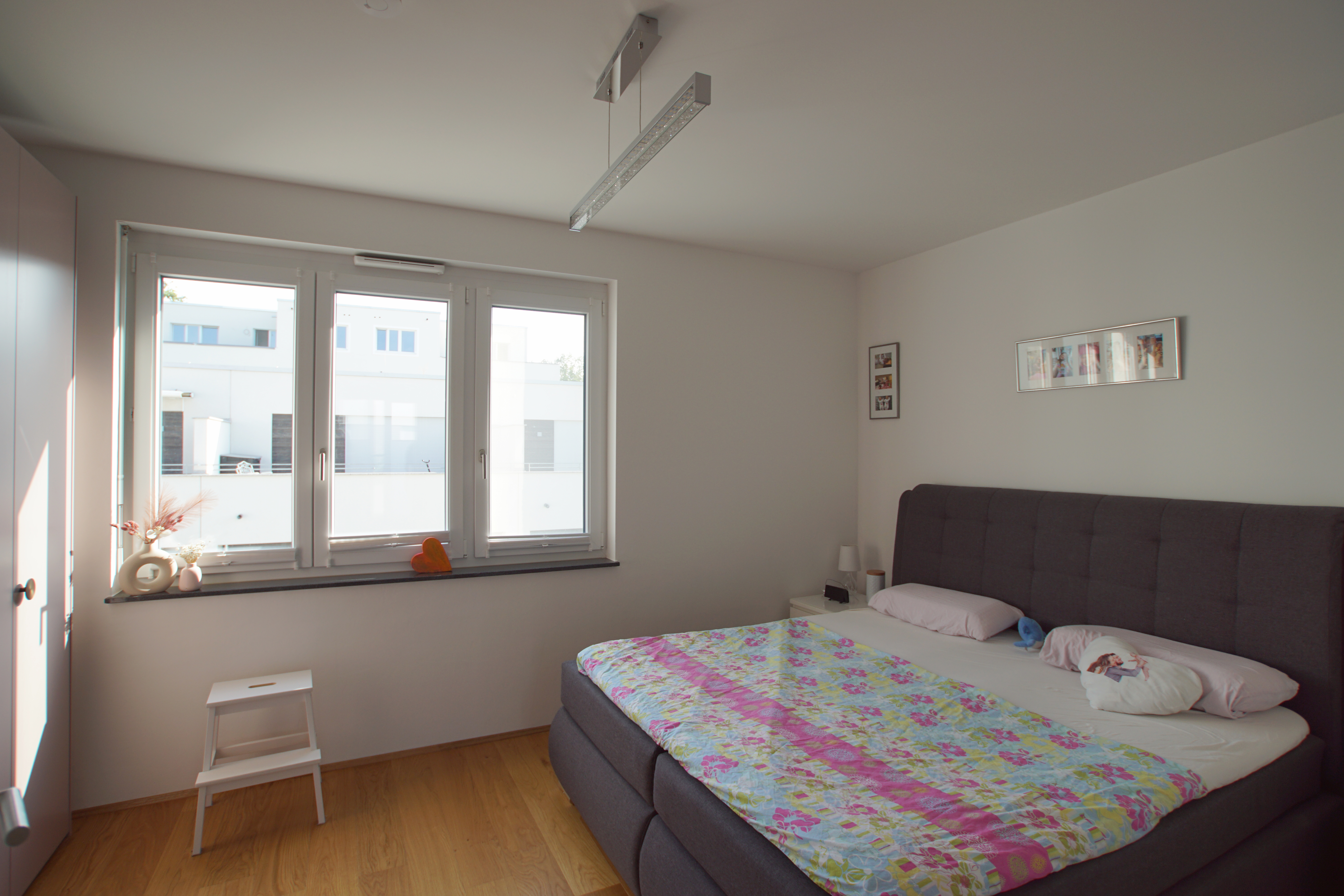 Das Objekt ist mit dreifachverglasten Fenstern und elektrische Rollläden versehen. Das Reihenhaus ist mit hochwertigem Parkett und Fliesenboden ausgestattet und verfügt über eine moderne Fußbodenheizung.