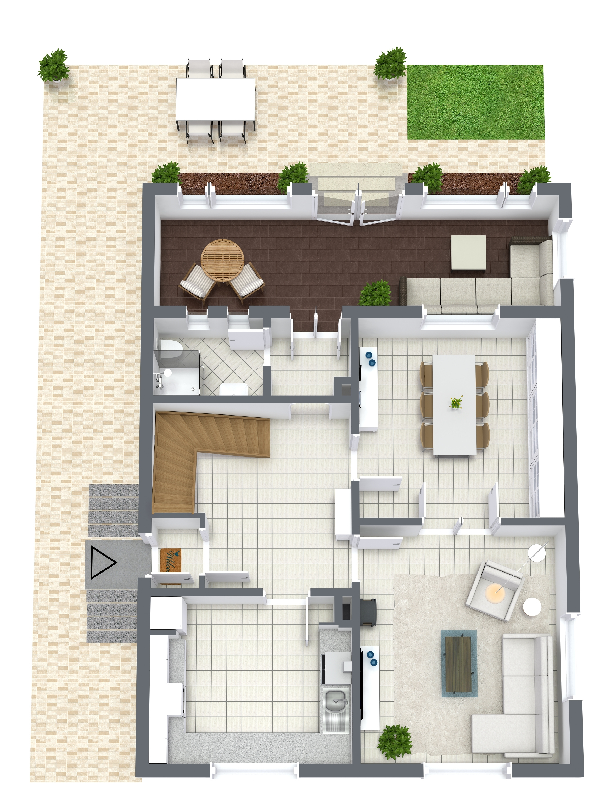 Im Erdgeschoss (Hochparterre) befinden sich neben dem Wohnzimmer mit angrenzendem Esszimmer die Küche, ein Tageslichtbad mit bodengleicher Dusche sowie der nachträglich angebaute Wintergarten, der sich über die gesamte Breite des Hauses erstreckt. Von hier aus erreichen Sie über wenige Stufen die Terrasse mit dem unmittelbar angrenzenden großen Garten.