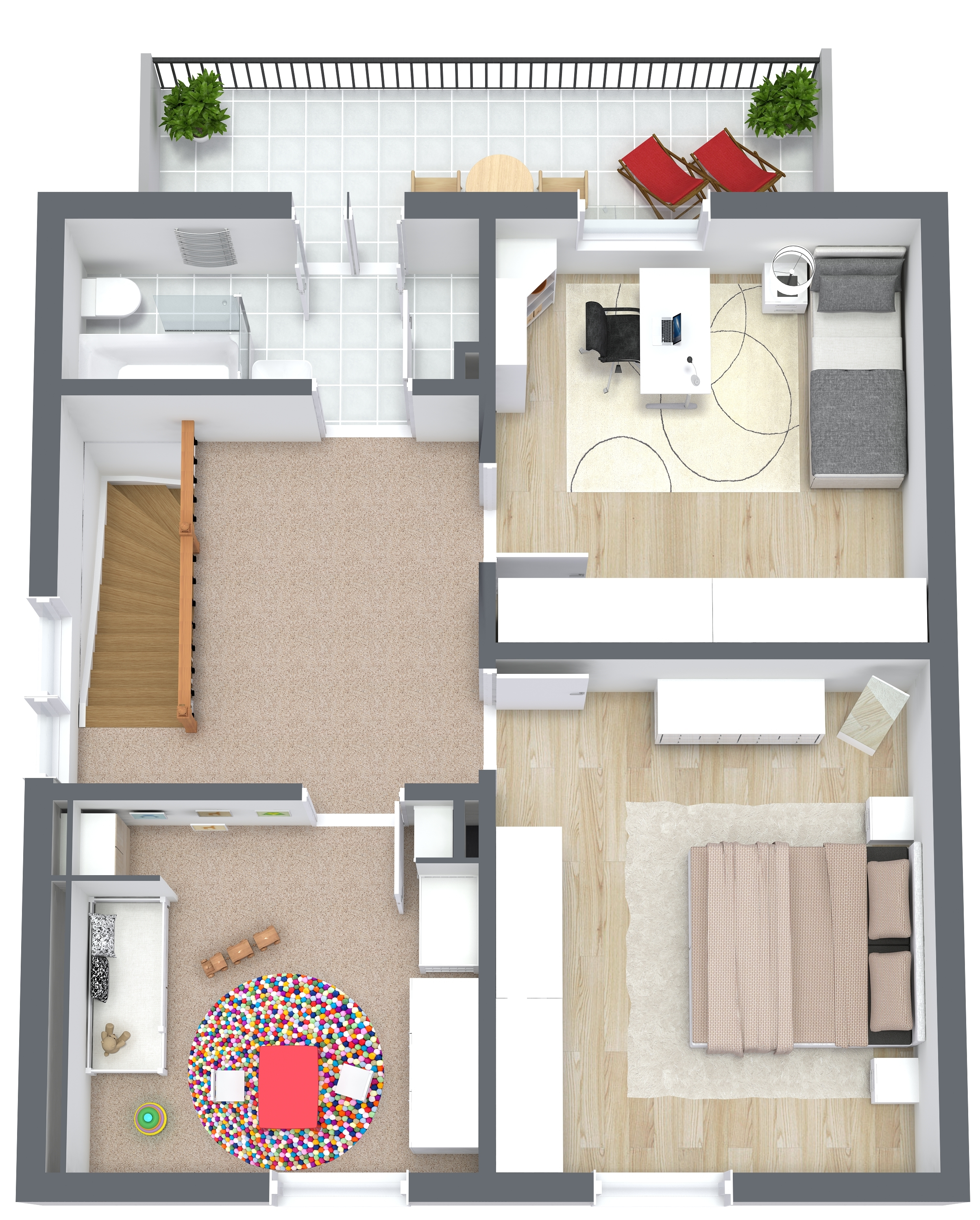 Über eine wohnliche massive Holztreppe gelangt man in das Obergeschoss. Dieses bietet durch Schrägen und Gauben eine gemütliche Wohnebene mit drei Schlafzimmern sowie einem weiteren Tageslichtbad mit Badewanne. Über das Bad erreicht man aktuell auch den großflächigen Balkon, der zum Garten hin ausgerichtet ist.