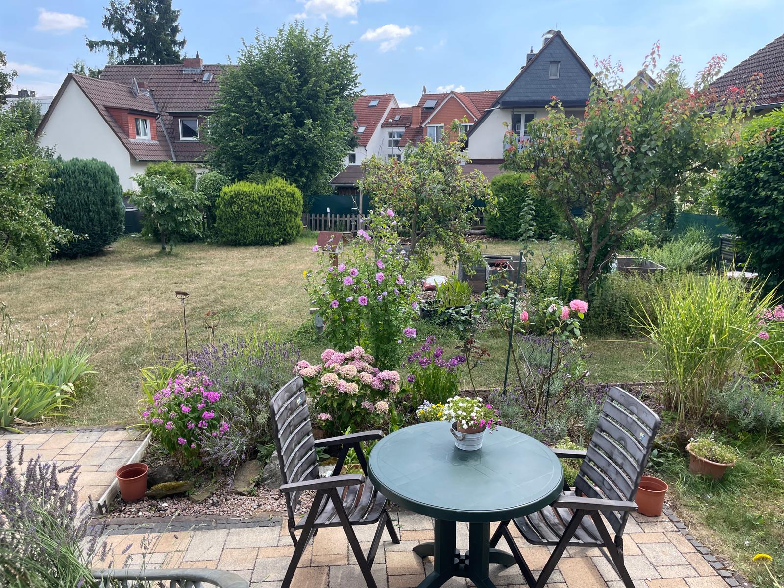 Im Erdgeschoss (Hochparterre) befinden sich neben dem Wohnzimmer mit angrenzendem Esszimmer die Küche, ein Tageslichtbad mit bodengleicher Dusche sowie der nachträglich angebaute Wintergarten, der sich über die gesamte Breite des Hauses erstreckt. Von hier aus erreichen Sie über wenige Stufen die Terrasse mit dem unmittelbar angrenzenden großen Garten.