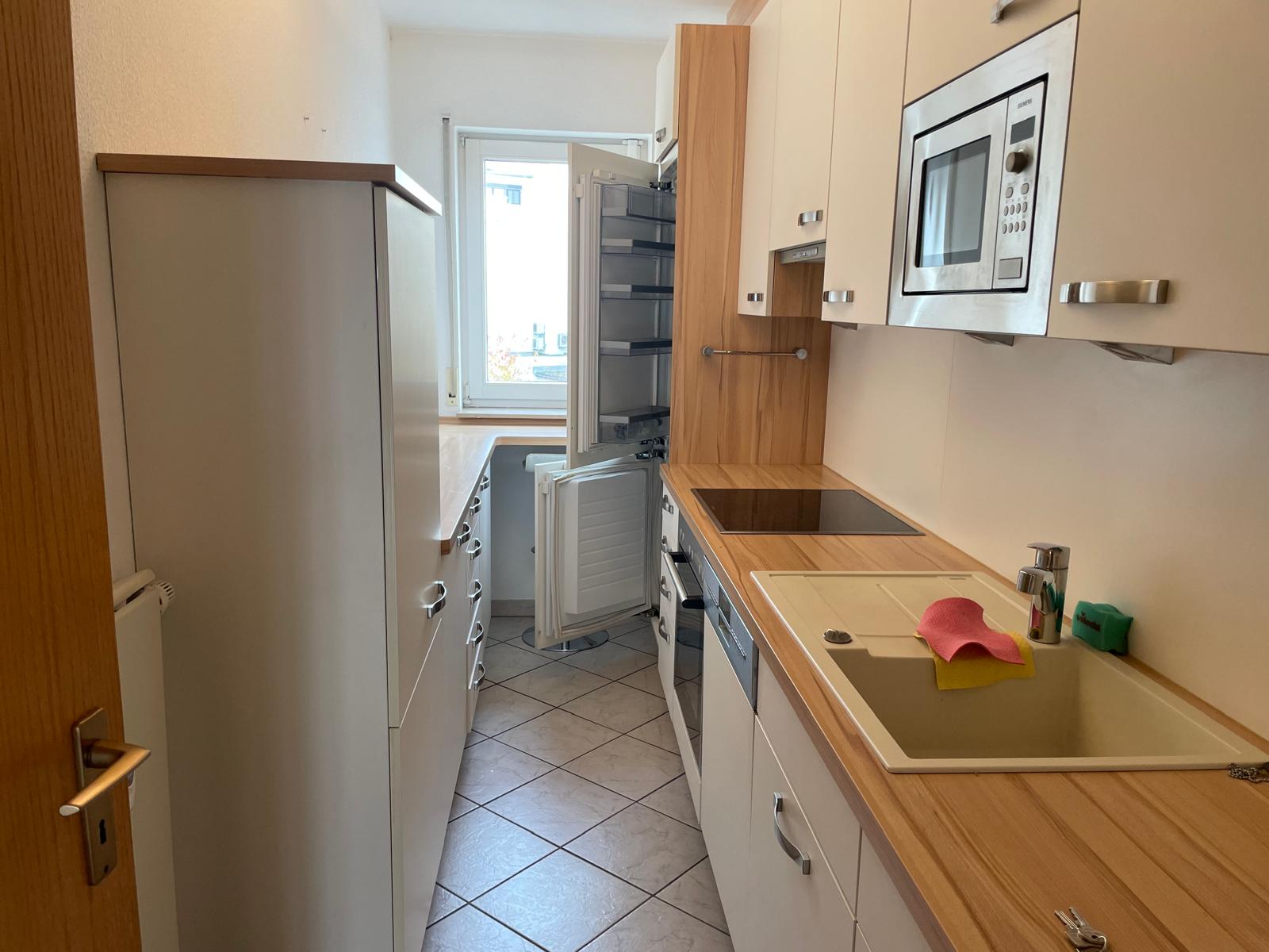 Rechterhand befindet sich das ca. 18 m² große Zimmer, welches vielseitig als Gäste-, Schlafzimmer oder Büro genutzt werden kann. Ebenfalls vom Flur aus erreichen Sie alle weiteren Räume dieser lichtdurchfluteten Wohnung, die Küche bestehend aus einer zeitlosen und hellen Einbauküche mit allen technischen Geräten, das zweite Schlafzimmer mit ebenfalls ausreichend Stellfläche für ein Bett sowie einen großzügigen Schrank.
