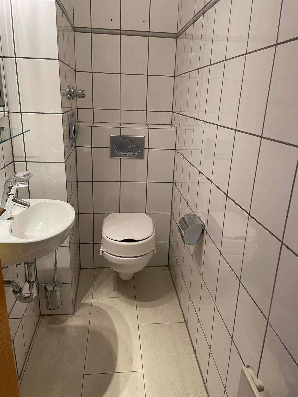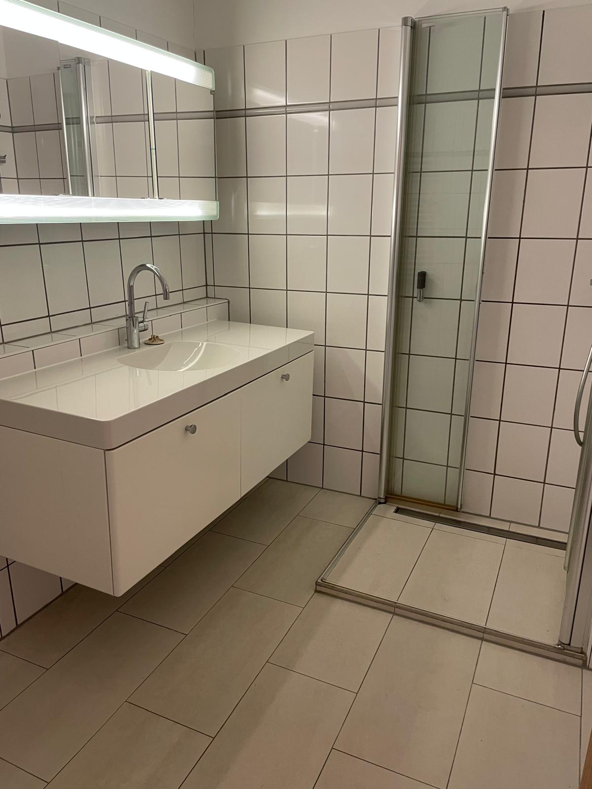 Am Ende des Flures finden Sie das Hauptbad inklusive bodentiefer Dusche, großzügigem Waschbecken und Waschmaschinenanschluss vor. Die Toilette befindet sich im Gäste-WC. Eine weitere Toilette kann jedoch ebenfalls im Hauptbad eingebaut werden.