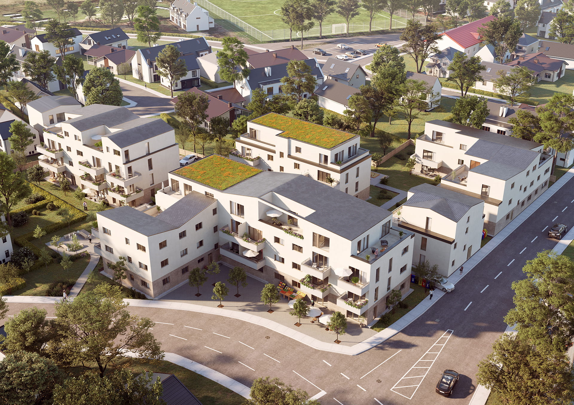 Die Wohnungen in den Obergeschossen haben Balkon oder Dachterrasse, die Einheiten im Erdgeschoss überwiegend eigene Gärten.