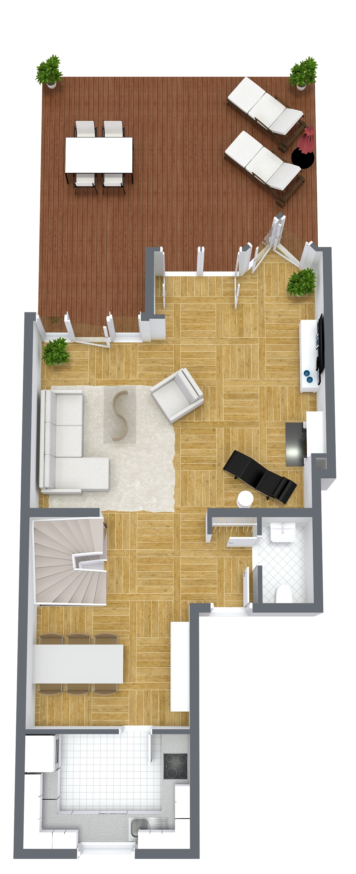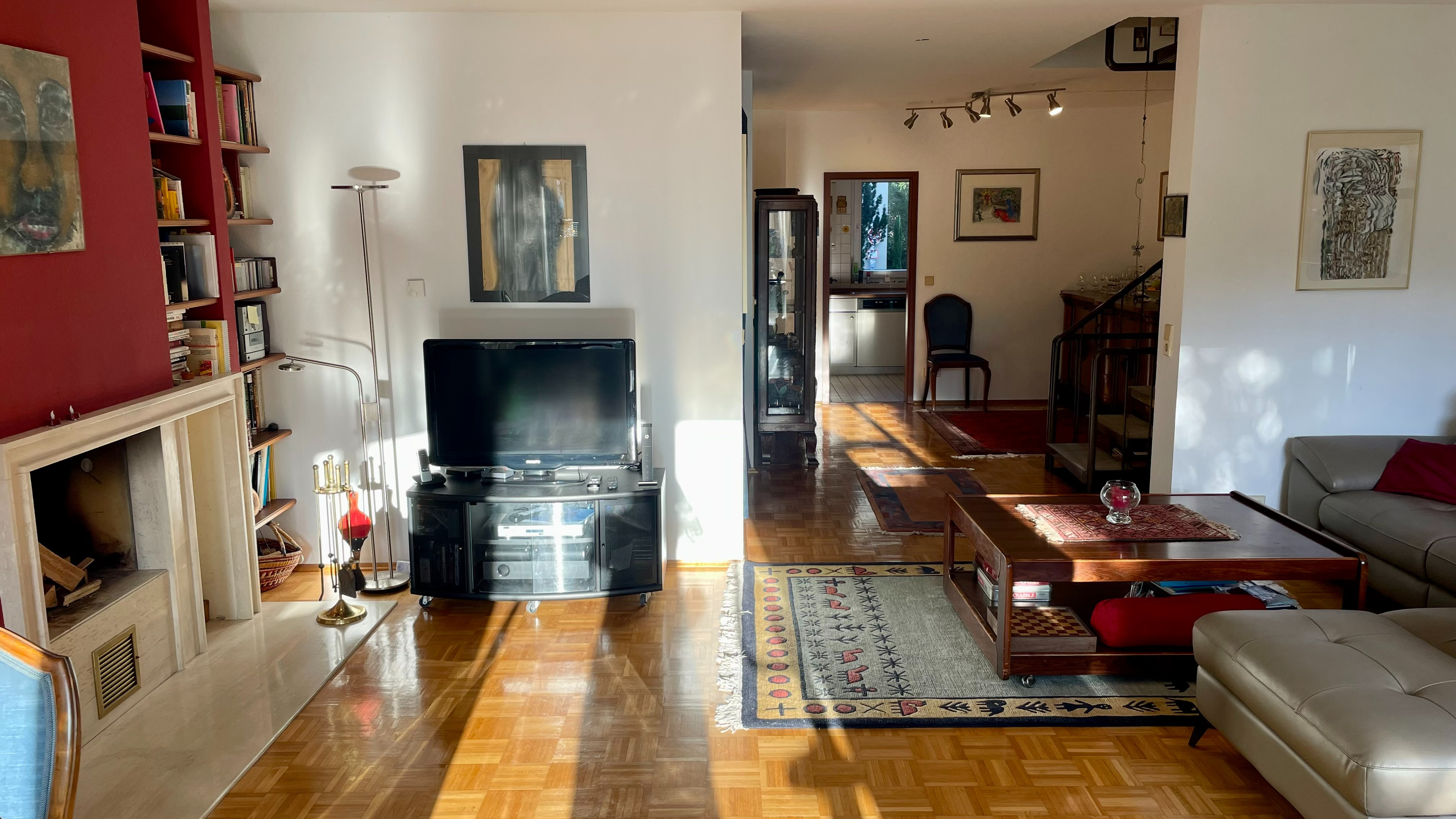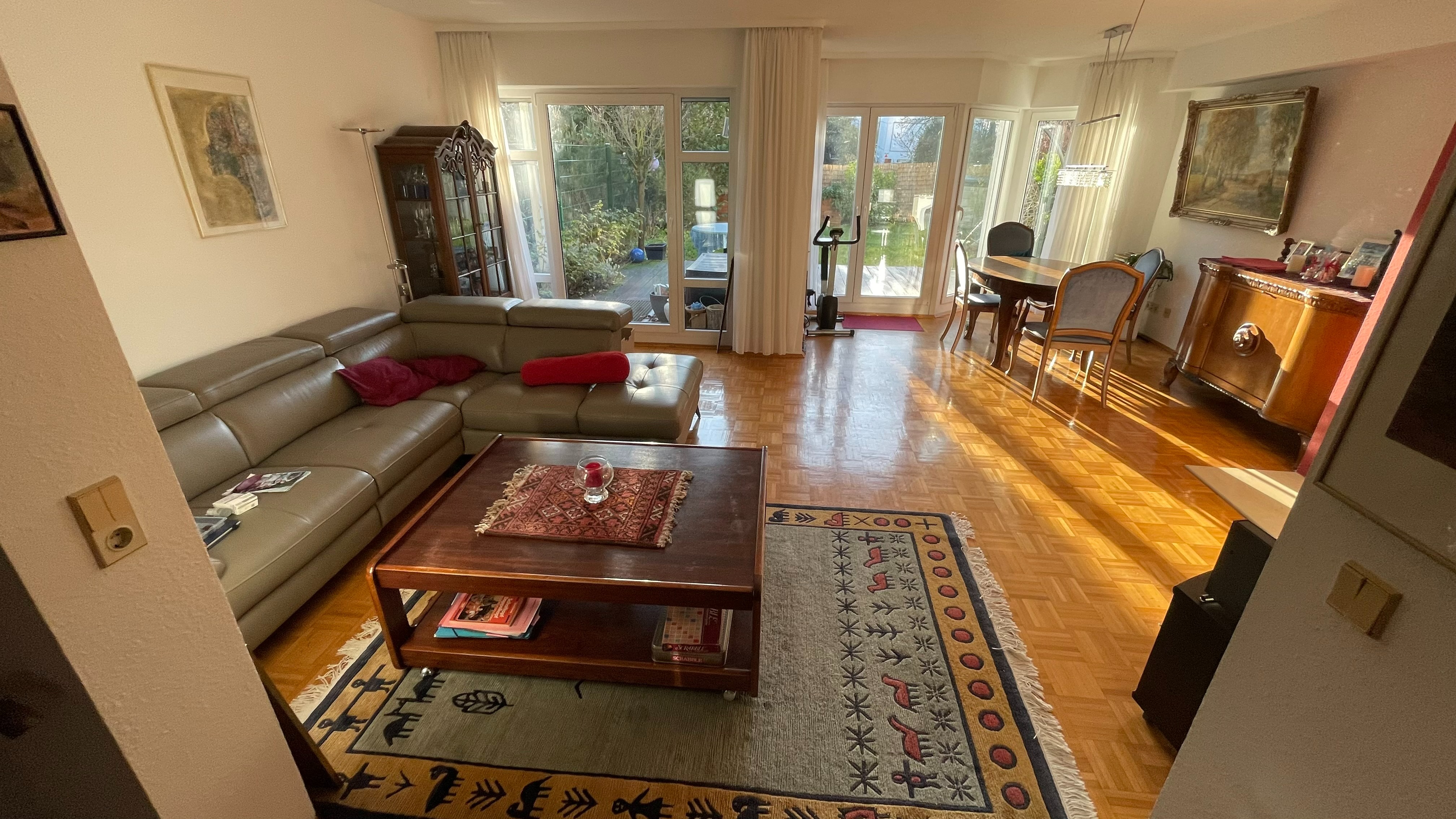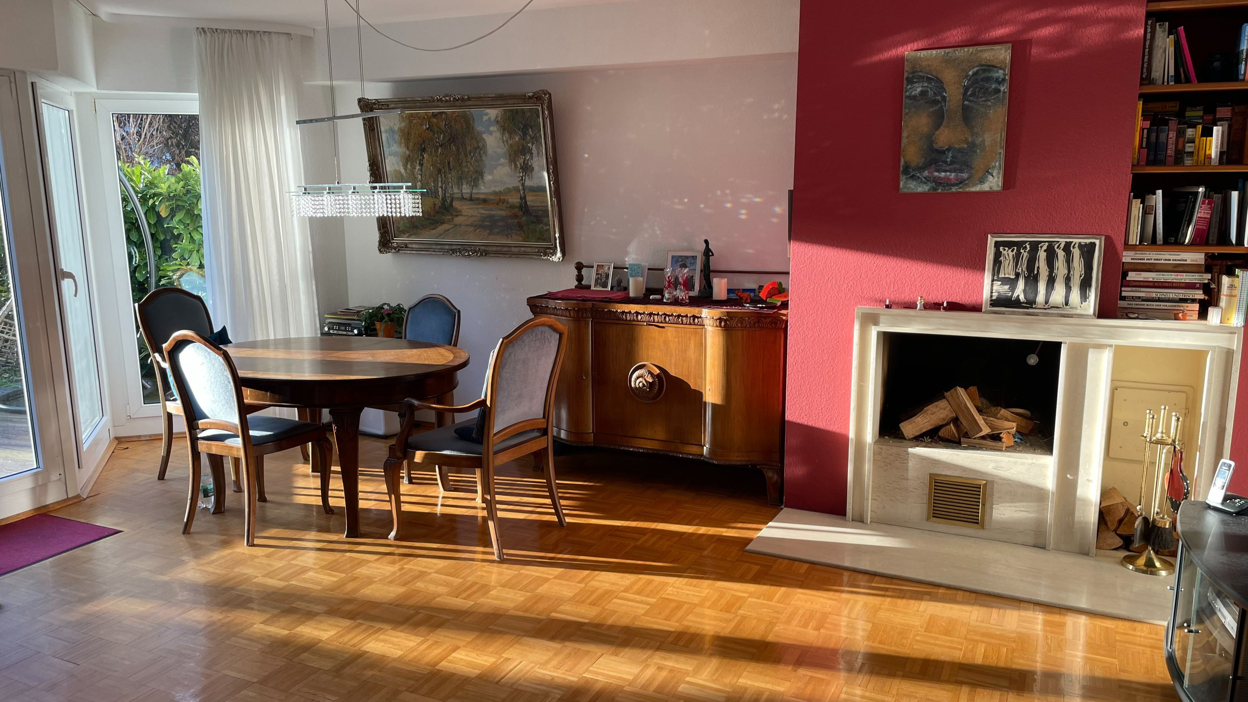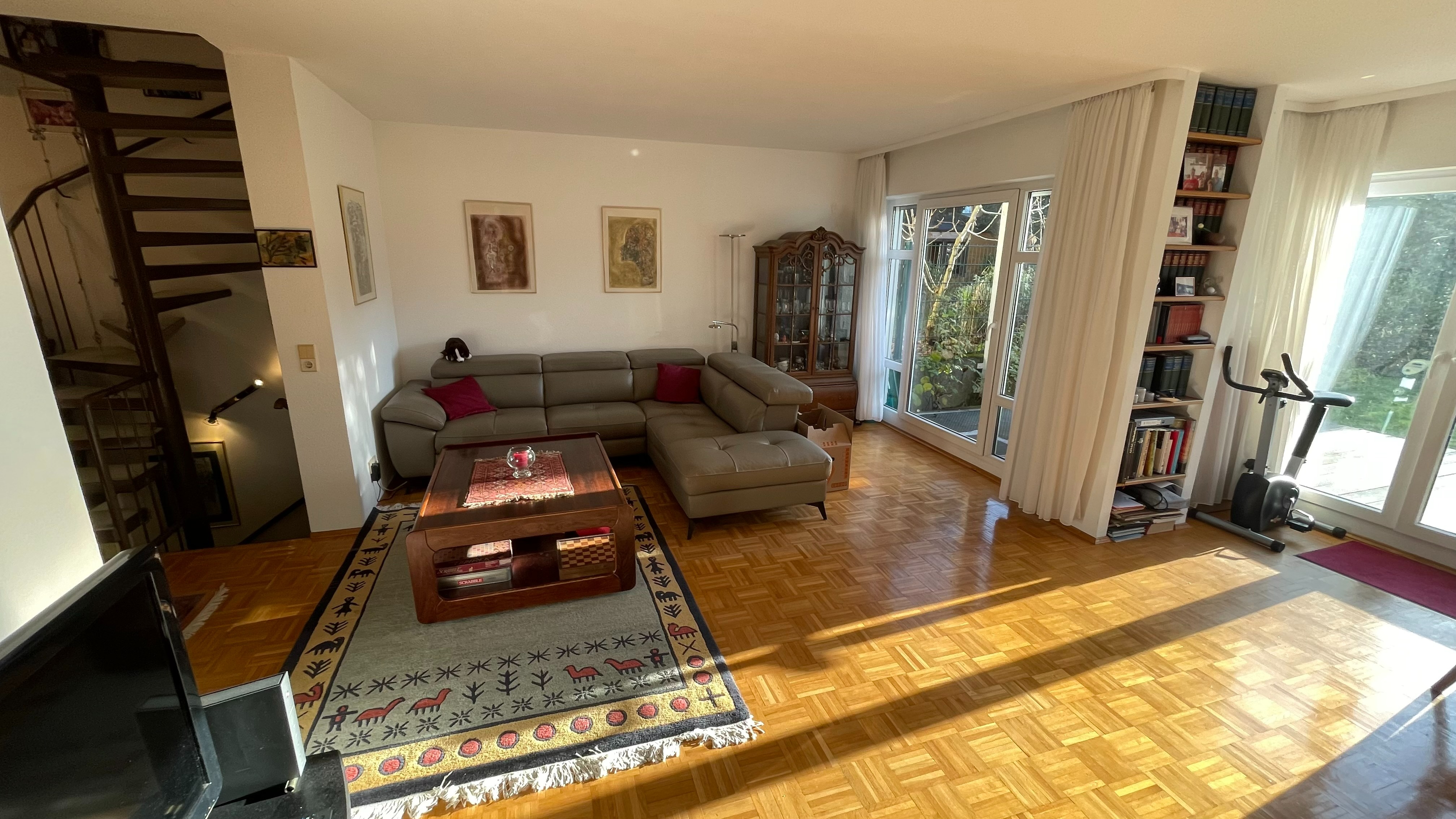 Den Haupteingang zu Ihrem neuen „Haus-im Haus“ erreichen Sie im Hochparterre. Auf dieser Wohnebene befindet sich der großzügig geschnittene Wohn-Ess-Bereich mit offenem Kamin, wunderschönem Echtholz Parkett sowie direktem Zugang zur Sonnenterrasse und zum eingewachsenen großen Privatgarten. Ebenfalls verfügt diese Etage über ein Gäste-WC und eine geräumige Küche.